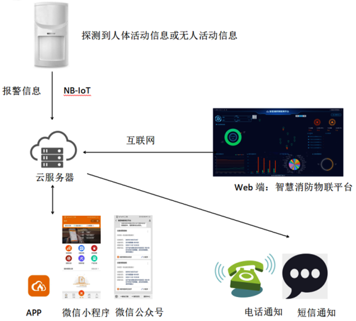 l NB-IoT通信 ,云平臺、APP、微信公眾號、微信小程序、電話、短信等多平臺報警通知