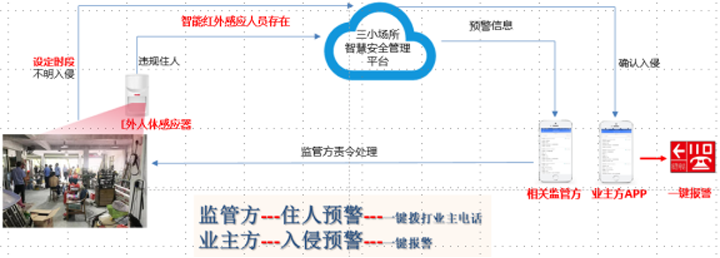 紅外人體存在感應器在設定的時間內(nèi)(可自由設置)實時感知三小場所夜間人員滯留情況,當探測到人員存在時,立即預警,推送報警信息至相關監(jiān)管方/業(yè)主方APP上。