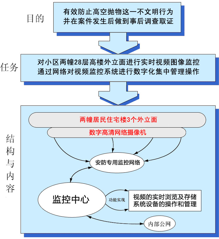 根據(jù)本次系統(tǒng)建設(shè)的框架和建設(shè)的思路,本次視頻監(jiān)控系統(tǒng)建設(shè)覆蓋小區(qū)內(nèi)兩幢28層高的居民住宅樓,覆蓋兩幢大樓的歌3個能夠發(fā)生高空拋物的監(jiān)控面。建成后的智能高清視頻監(jiān)控系統(tǒng)將能夠?qū)ψ≌瑯峭饬⒚孢M(jìn)行實(shí)時(shí)監(jiān)控及分析,形成統(tǒng)一的監(jiān)控網(wǎng)絡(luò),實(shí)現(xiàn)對大樓高空拋物事件的重點(diǎn)監(jiān)管。我們規(guī)劃建設(shè)一套完整的數(shù)字化、高清化的視頻監(jiān)控系統(tǒng),利用當(dāng)今成熟的數(shù)字視頻壓縮技術(shù)、多媒體技術(shù)、光纜傳輸技術(shù)、電視監(jiān)控技術(shù)、網(wǎng)絡(luò)技術(shù)等,構(gòu)建一套適合于整個項(xiàng)目的高空拋物防控體系。